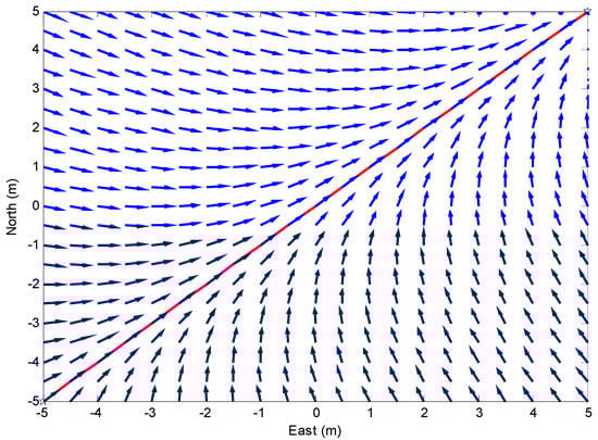 As discussed above, the guidance system plays an important role in autonomous ships. It calculates the desired heading or course angle based on the orthogonal distance between the ship and the path. In a simple word, the guidance law plays the same role as an experienced sailor. In this section, a vector field guidance law is used for the path-following control of the underactuated marine surface ship. The vector field method is a novel guidance law for marine ships. Its main principle is to generate vector space around the path to be followed, and all the vectors point to the path smoothly, as presented in Figure 6. The vectors usually denote the desired travelling direction (course angle) for the autonomous vessels. If the ship follows the vectors, it will ultimately converge to the predefined path.