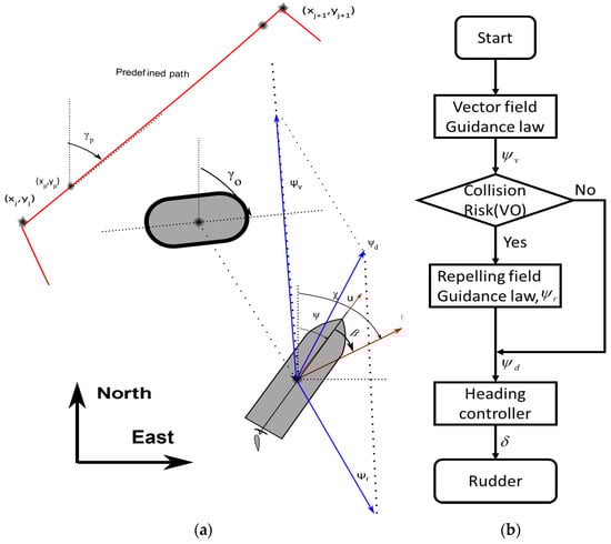The proposed collision avoidance system for autonomous surface ships ((a): geometry chart; and (b): the flowchart).