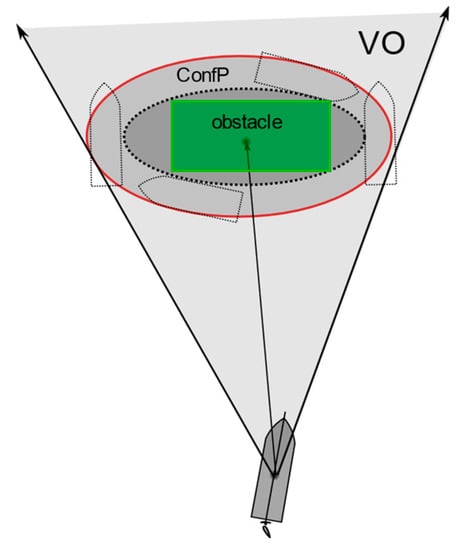 Usually, the collision position is defined using the Minkowski addition [41,44]. Here, to simplify the problem, ship safety domains [53] can be used for reference to defined a conflict position (ConfP), as presented in Figure 8. The conflict position (ConfP) is the area surrounded by a red elliptical line. The velocity obstacle (VO) can be defined as