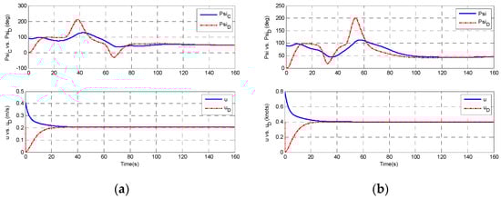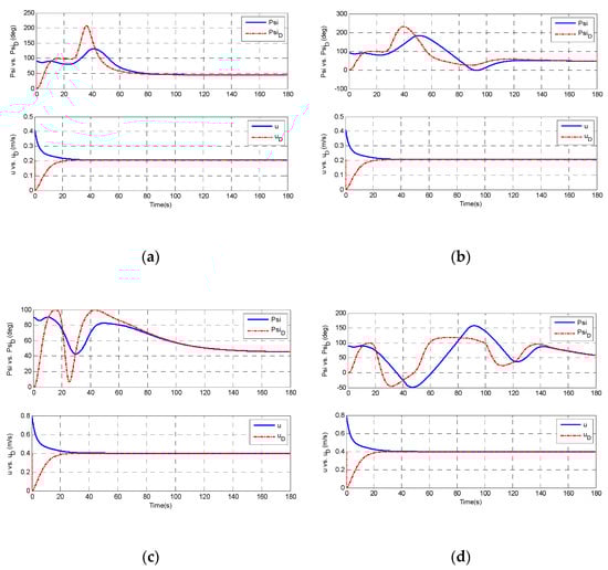 In the beginning, the ship travels at a high speed, then the ship will reduce its speed to avoid the obstacles. During the collision avoidance, the ship travels at a constant speed. Figure 11 shows the heading angle and surge speed (desired versus true) in four cases. The ship tracks the desired heading angle, as presented in Figure 11. It demonstrates that the autopilot works well in the simulations. When the collision risk control is switched off, the underactuated surface ship takes a long time to converge to the desired heading angle, which is due to the alternative actions of repelling field and vector field guidance laws. This phenomenon is more obvious in Figure 11d.