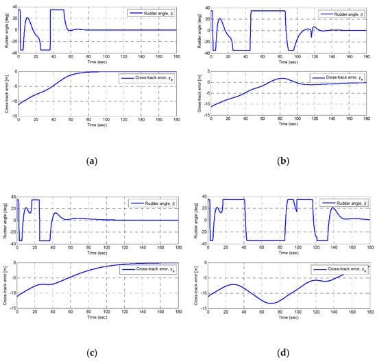 Figure 12 presents the rudder angles, cross-track errors in the simulations. The chattering due to the sliding mode control is diminished using the saturation function. The collision risk can reduce the rudder oscillations and have smaller cross-track errors, as presented in Figure 12a,c. In Figure 12b,d, the cross-track errors increase a bit when the ship approaches the obstacle. This is because that the repelling vector field plays a major role in the guidance system, and almost completely cancels the effect of the vector field guidance law.