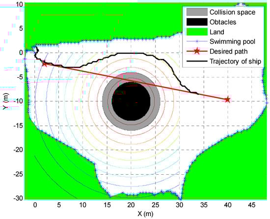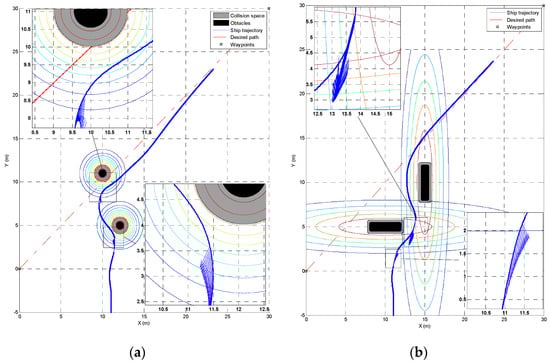 In the simulation, one static obstacle near the path is considered. When the obstacle is round, as presented in Figure 10a,b, the deviations are set as, . When the obstacle is rectangular, an asymmetric repelling field can be generated by setting the different deviations in the x and y directions, as presented in Figure 10c,d. The deviations of the repelling field can be set as , where L is the length of the ship and B is the width. The obstacle locates at the same position in both case, .