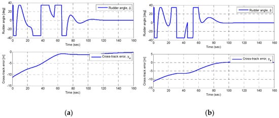 Rudder angle, cross-track errors: (a) multi round obstacle; and (b) multi rectangular obstacle.