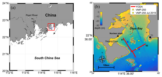 (a) Location of Daya Bay (DYB) along the southern coast of China. The arrow indicates the sea wind direction. (b) Bathymetric map of DYB, in which S1 and S2 indicate the two YODA observation transects (red lines). The yellow triangle and square indicate the locations of VMP-250 profiler observations and the blue arrows indicate vessel route directions. T1 (black circle) is the observation station of tidal elevation.