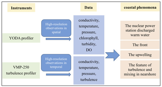 Understanding the small-scale physical and biological processes in coastal and estuarine areas is a pressing issue in oceanography. In recent studies, small-scale physical processes in these areas have been observed [11,16,17]. Anthropogenic activities are considered the most important factor in the degradation of the DYB marine environment in recent years [10,18]. Therefore, studies of the hydrological and ecological processes in DYB are important for understanding the impacts of human activities on the ecology of DYB. Fixed-site and remotely sensed observations are commonly used in these studies [10,19,20,21,22]. For example, Tang et al. [10] obtained remote-sensing data from the Advanced Very High-Resolution Radiometer (AVHRR) satellite to study the thermal plume discharged by the nuclear power station into DYB and analyze its seasonal characteristics. Sun et al. [19] and Yang et al. [22] studied the long-term changes in phytoplankton response patterns in DYB, using fixed-site observations. However, satellite remote-sensing and fixed-site station observations have a disadvantage in that these observational methods cannot be used to obtain high-resolution internal profile characteristics. Satellite remote-sensing observation can only observe sea surface information. In situ conductivity–temperature–depth profiler (CTD) observation of fixed-site station often lacks continuity of spatial and temporal results.