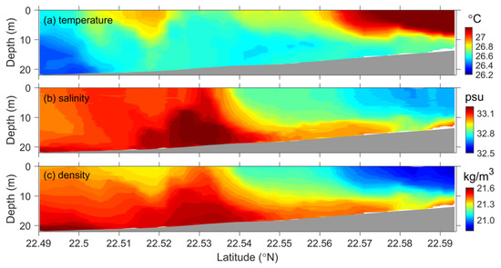 (a) Temperature, (b) salinity, and (c) density along transect S1 as measured by the YODA profiler.