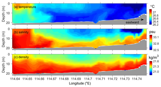 The different water masses along transect S2 could be separated into the following three distinct areas. Area 1 had a longitude greater than 114.7° E, with cold and fresher water in the upper layer. Area 2 was found between the longitudes 114.655° E and 114.7° E, with saltier water present near the bottom and no obvious changes in temperature with depth. Area 3 had a longitude less than 114.655° E, with warmer and fresher water present near the surface. Generally, water on a shelf is cooler and fresher than in the adjoining ocean, leading to the formation of a shelf break front [26]. Therefore, it was reasonable to assume that the cold water at longitudes greater than 114.7° E originated from the bay. The area between 114.655° E and 114.7° E was considered a transition region.