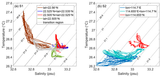 Temperature–salinity (T–S) diagrams for transects (a) S1 and (b) S2. Dashed lines indicate potential densities.