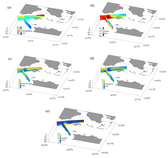 Three-dimensional view of (a) temperature, (b) salinity, (c) chlorophyll-a, (d) dissolved oxygen, and (e) turbidity distributions.