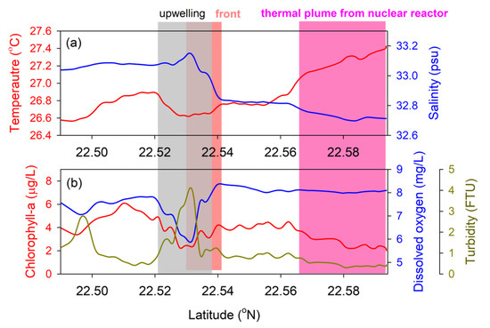 (a) Temperature, salinity, (b) chlorophyll-a, dissolved oxygen, and turbidity at a depth of 3 m along transect S1. The filled backgrounds indicate the upwelling (gray), front (orange), and warm discharge water from the nuclear reactor (pink).