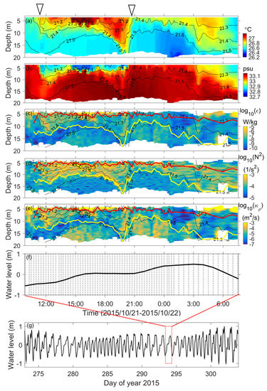 Time courses of (a) temperature, (b) salinity, (c) dissipation rate, (d) buoyancy frequency, (e) diffusivity, (f) water level during the observation periods, and (g) water level of October 2015. Isopycnal contours (solid lines) in (a–e) represent density. The front is marked with an inverted triangle in (a). In (c–e), the red line indicates the surface mixed layer, whereas the yellow line indicates the bottom mixed layer. Vertical dotted lines in (f) indicate the time points of VMP-250 observations. The water-level data in (f,g) were derived at the tidal elevation station T1.