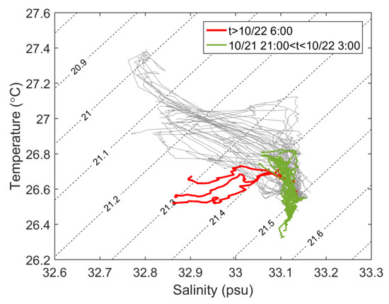 The T–S sections and T–S diagrams (Figure 10) indicate that the water masses at various stations comprised distinct water masses. For example, between 21:00 on 21 October 2015 and 3:00 on 22 October 2015, the water temperature was low and salinity was high, especially in the bottom mixed layer. This was a period of high tide, indicating that SCS water was dominant during this period. From 6:00 to 8:00 on 22 October 2015, the upper layer of water exhibited a low temperature and low salinity. This was the ebb tide period, indicating that DYB water was the dominant water mass. Compared with the Figure 6, the characteristics of the seawater was confirmed. The observation station was located at the confluence of the SCS and DYB, which changed constantly under the action of tides. With the interactions at the confluence, an abundance of thermohaline structures was formed.