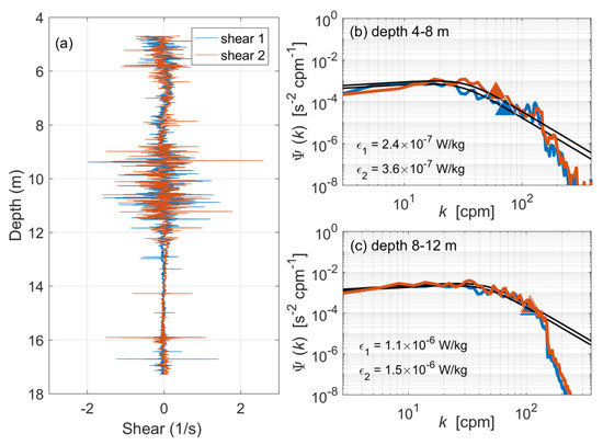 (a) Examples of raw microscale velocity shear in specified depth segments during data recording at 12:15 on 21 October 2015 and (b,c) the corresponding dissipation spectra. The smooth curves overlapping the dissipation spectra represent the Nasmyth universal spectrum, and triangles indicate the upper limit of integration.