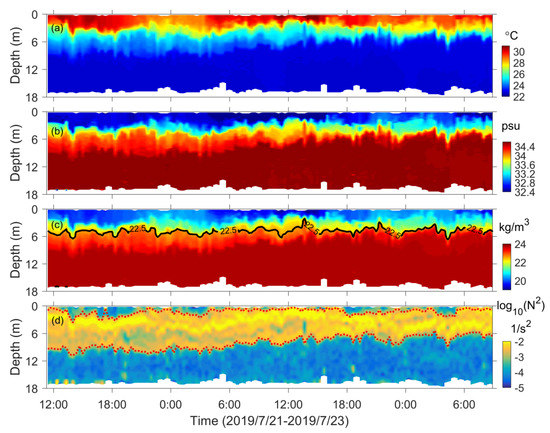 Time courses of (a) temperature, (b) salinity, (c) density, and (d) buoyancy frequency as measured by YODA in July 2019. The black line in (c) indicates a density of 1022.5 kg/m3. Red dotted lines in (d) indicate the surface and bottom mixed layers.