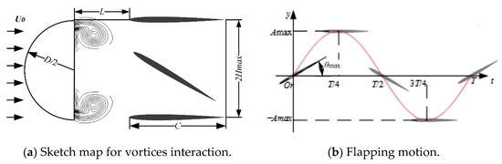 Based on previous research, the foil and the cylinder are the same scales, as shown in Figure 1a, where U0 is the velocity of the incoming flow and it is adopted as the characteristic velocity. D is the diameter of the cylinder and L is the distance between the D-section cylinder and the flapping foil. One of the main influences of the oncoming vortices on the flapping foil is when the vortices encounter the foil, which is believed that the different heaving amplitudes are quite outstanding when flapping in the wake. Thus, the parameter L is not discussed. Further work will be conducted on the length scale. Here, the length scale L is set as L = D/2 and the foil chord length is C where C = D. Amax is the amplitude of the heaving motion. The foil chord length is selected as the reference length. The Reynolds number can be defined as Re = U0C/υ. Here, υ represents the kinematic viscosity of the fluid. In this article, the Reynolds number is fixed as Re = 2 × 104, which is identical to the number adopted in Young et al. simulation [7]. As for the coordinate system, the origin point is set behind the center of the cylinder for a length of L. The positive directions of the abscissa and ordinate axis are shown in Figure 1a.