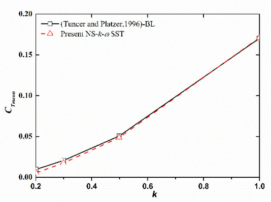 The finite-volume method is applied to achieve the spatial discretization of the Navier–Stokes equations (Equations (6) and (7)) and temporal discretization is performed using the second-order accuracy backward-implicit scheme. The k-ω SST turbulence model includes the transverse dissipative derivative term, which has been commonly tested and believed to be suitable for the turbulence and shear flow, used with wall restriction, which is employed here to solve the unsteady flow. The method is validated by Ashraf et al. [7] and the results agree very well with the published results shown in Figure 2, where k = Srπ/C.