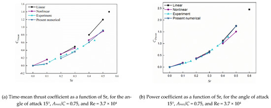 In order to confirm the accuracy of this mesh method with the k-ω SST turbulence model, it is tested again to compare with the experiment and linear and nonlinear theory results [25]. Figure 3 provides the thrust coefficient and power coefficient as a function of Sr for the angle of attack at 15°, the amplitude of heaving motion Amax/C = 0.75, and with = π/2. The agreement between theory, experiment, and present simulation is fair overall.