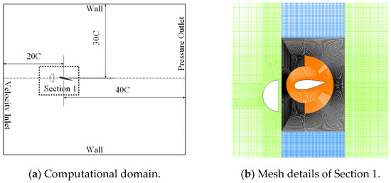 The computational domain is considered as a square area in this study. The inlet velocity boundary is at a distance of 20C from the pitching center of the foil, as u = (U,0) and . As for the no-stress outflow boundary condition, u = (0,0) and p = 0 are used and the downstream pressure outlet is at a distance of 40C from the pitching center of the foil. The slip wall condition is used for the upper and lower flow boundaries located at a distance of 30C from the central line of the cylinder. With the chosen meshing strategy case 6, where y+ = 0.8, the first mesh layer could be estimated. The flow field is divided into three zones. The pitching foil is surrounded by structured grids (the orange color) and the up-down zone (gray color) and the fixed zone (blue and green color) are both constructed using a structured mesh, which is shown in Figure 4. Moreover, the DEFINE_CG_MOTION function and User Defined Function(UDF) [26] are used to handle the prescribed motion equations (Equation (2)) and regenerate the interface boundaries between the pitching zone and up-down zones. The formula presented by Kinsey and Dumas [27] is adopted to determine the time steps of the simulation and the formula is expressed as , where T is the oscillation period and ||v|| is the maximum instantaneous convective flux velocity in the computational domain.