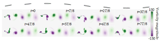 The flapping foil is described as a propulsion device by DU at the condition that Re = 1100. However, we are concerned with the situation declared by M.A. Ashraf et al., where the Re = 2 × 104. The non-dimensional frequency of the flapping foil is fixed at Sr = 0.3. The total flapping cycle and the vorticity magnitude are shown in Figure 5.