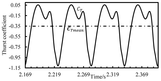 Instant thrust coefficient and time-mean thrust coefficient in two flapping cycles.