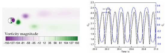 The instant drag coefficient and lift coefficient of the D-section cylinder are shown in Figure 7b. Both the curves exhibit very good periodicity and the period of the lift variation is twice of that with respect to the drag variation.