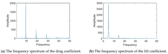 Frequency spectrum of the drag coefficient and lift coefficient.