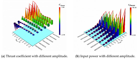 The flapping foil is placed in the wake generated by the D-section cylinder, with a gap of 0.5D. The vortices shedding from the flapping foil will interfere with the on-coming VKW, which keeps growing. The interaction is mainly dependent on the heaving amplitude. Here, the flapping motion is limited with a flapping frequency of Sr = 0.3. The hydrodynamic performance of the flapping foil is described by the time-mean thrust coefficient and the energy-consuming power coefficient. The two parameters changing with respect to the heaving amplitude and foil thickness are shown in Figure 9 with 3D bar graphs.