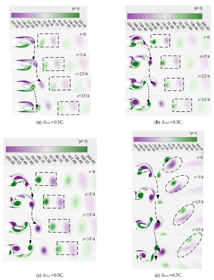 As shown in Figure 11, the vortex wake is a regular structure when the foil flaps in the wake with Amax < 0.5C. A pair of vortices are formed behind the foil during a flapping process. When the Amax > 0.5C, the vortex shedding from the foil will merge with the oncoming wake and will be disturbed by the foil. Consequently, a pair and one single vortex are formed, shown in Figure 11d. LEV is inhibited, which results in a low-pressure area in front of the foil and the thrust is enlarged when the amplitude increases.