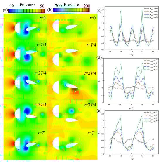 Pressure distribution during one flapping cycle for (a) Amax = 0.2C and (b) Amax = 0.7C; (c) CT, (d) CL, and (e) CM in two flapping cycles stands for NACA0030 with different heaving amplitudes under the condition that Sr = 0.3 and Re = 2 × 104.