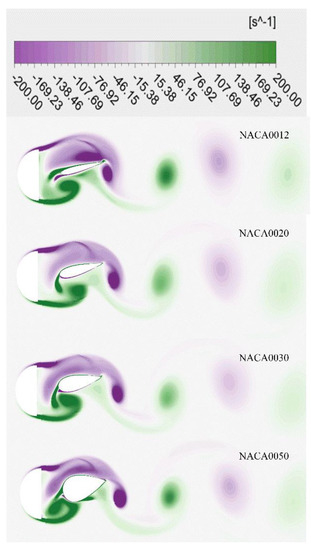 The thickness of the flapping foil plays an important role in improving the propelling force. The thrust of the thicker foil is higher than the thinner foil, as shown in Figure 9a. The vortex streets of different foils are shown in Figure 13.