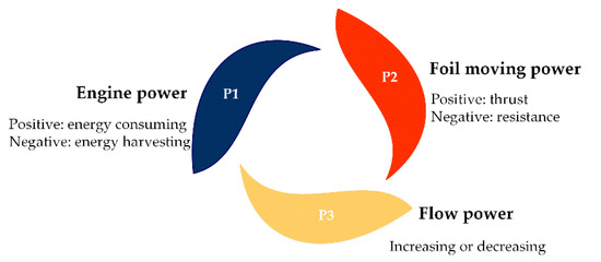 A negative value stands for the energy extraction from the oncoming wake by the foil and a positive value reflects that the engine’s power is driving the flapping foil.