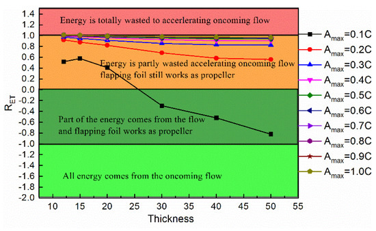 When applied to Equation (8), the tendency of the energy transformation that varies with thickness is shown in Figure 16. The four conditions of the results described above are padded with different colors. The bright green color reflects that the flapping foil in the oncoming wake works as an energy harvester. Dark green means that the flapping propulsion device extracts energy from the oncoming wake and the energy provided by the engine. The orange stands for a common propeller driven by the engine. The red color indicates that the flapping foil performs negatively under these conditions.