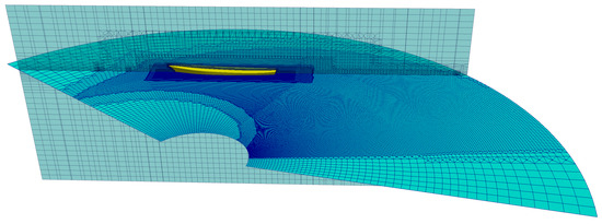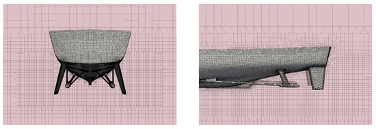 The mesh is refined by the definition of several blocks around the ship. The largest one is the whole computational domain whose main dimensions are reported in Table 1 and, graphically, in Figure 4. The overall domain is modelled by the blockMesh OpenFoam command, while the smallest block is modelled separately by the usage of the CfMesh library. This is due to the superior ability to handle complex geometries with CfMesh with respect to the standard mesh generator libraries adopted in OpenFoam. The dimensions of the overall domain are automatically computed as a function of the ship’s length. The computational domain is discretized with an hex-dominant Cartesian mesh made of several mesh refinements as shown in Figure 5 and Figure 6.