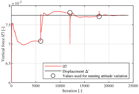 At the end of each step, the vertical force and pitch moment acting on the ship are evaluated, and the running attitude is modified. Figure 7 and Figure 8 show the convergence of the vertical force and the pitch moment (red lines) due to the modified attitude versus the external forces (black lines). After the first 6000 iterations, the average value of Z and M are evaluated, and the trim and sinkage are updated considering equations based on the metacentric hypothesis. This algorithm takes as input data the waterline area, the volume, the longitudinal metacentric radius and the forces formerly defined and it computes the trim and the sinkage of the ship.