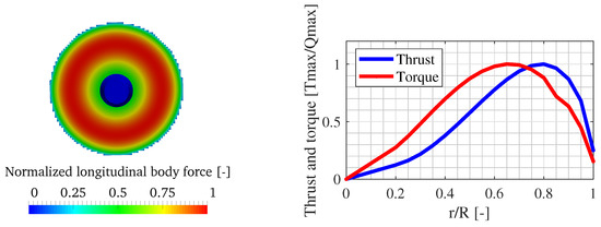 The presence of the propellers is described by an actuator disk model, which provides an acceleration effect on the flow by the adoption of body forces. The actuator disk model was developed by UNIGE, and it has been extensively validated in previous studies [30,31]. The thrust and torque radial distribution are taken as input for the actuator disk model. The radial distributions are obtained by the cited studies on the propeller–rudder interaction and they are reported graphically in Figure 10. The values of total thrust and torque developed by the propellers are forced equal to MARIN captive tests measurements.