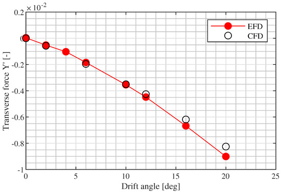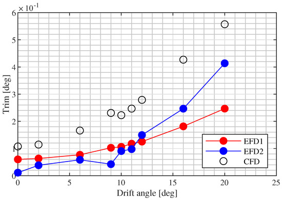 This subsection reports the comparison between the CFD results and experimental measurements on the 5415 model (bare hull configuration). As the first step, the capability of the proposed method to capture the running attitude during the tests was checked. The experiments provided data about the trim and the sinkage of the ship measured in pure drift static tests. Positive sinkage means that the draft increased, and positive trim means that the ship trims by the bow.