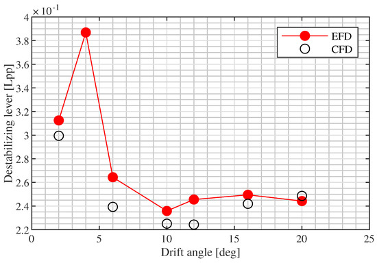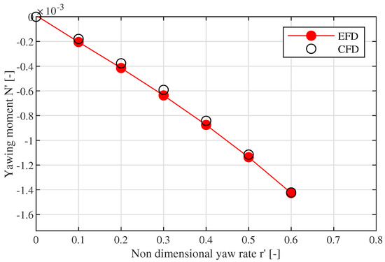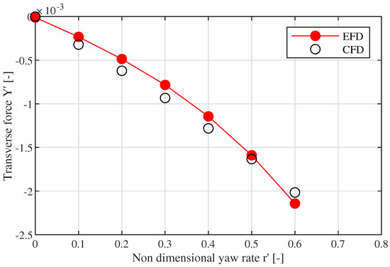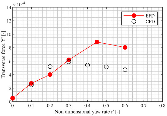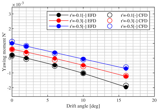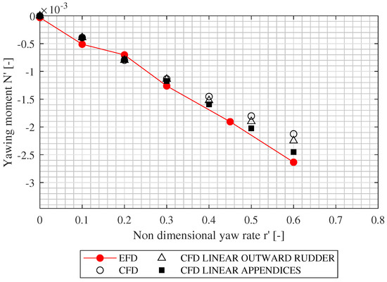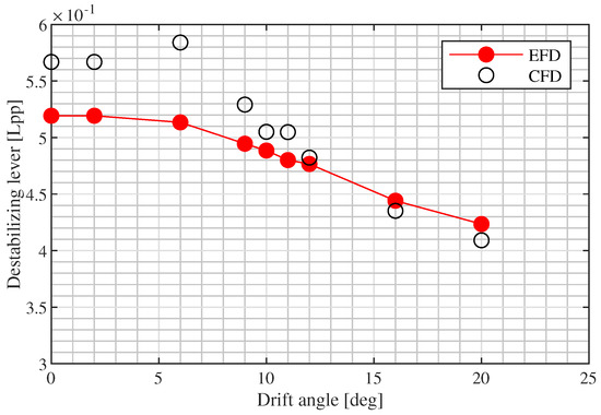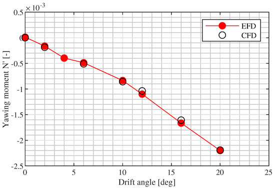 This study, despite being conducted on a well known subject, offers an interesting reflection and presents some original features in the calculation of the ship’s hydrodynamic derivatives. First, the CFD calculations are performed with a steady solver, which drastically reduces the calculation time of each CFD simulation with respect to similar studies conducted with an unsteady solver [18]. This shortening of the required computational time makes this approach more attractive from a day-by-day application standpoint.