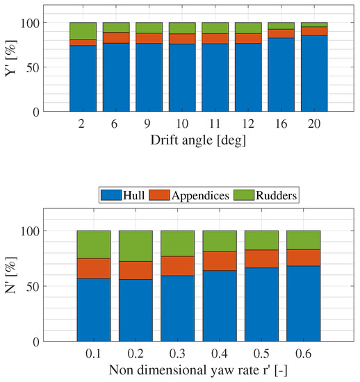 Regarding the time-domain simulator, this paper adopts a modular approach [20,21], which consists of an independent description of the different force and moment components acting on the ship during the manoeuvre. The hull, rudders, appendices and propellers are modelled separately, and correlation factors are taken into account in each module.