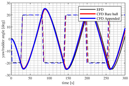 This work focuses on the hull and appendages forces; thus, all the other hydrodynamic devices are described by mathematical models calibrated on literature results and/or experiments. The details of the rudder, propeller and appendages mathematical models implemented in the time-domain simulator are not discussed in this study.