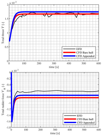 This process is iterated at least three times, allowing the system to reach an equilibrium of forces and moments, as shown in Figure 7 and Figure 8. The number of iterations is chosen such that a satisfactory balance between the forces and moments is obtained at the end of the simulations. The difference between the vertical force and the pitch moment computed by OpenaFoam and that expected from the loading condition of the model was less than 5%, which is considered a satisfactory result. This process guarantees evaluation of the hydrodynamic forces acting on the hull, also considering the ship attitude, with a reduced computation time (about 72 h on a 24-core infrastructure for full appended calculations).