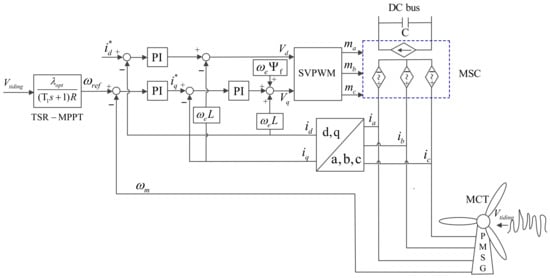 As shown in Figure 3, in the machine-side converter, a low-pass filter [2] is added to the TSR-MPPT strategy to preliminarily smooth the marine current power. Feedforward decoupling and field-oriented vector strategy are applied. The power generated by PMSG is delivered to the DC bus by MSC [26].