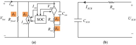 where Pbat, Psta, respectively, represent the terminal power and stack power of VRB; Req and CSCB, respectively, represent equivalent resistance and equivalent total capacity [31], as shown in Figure 5b.