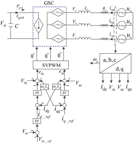The control structure of the grid-side converter is shown in Figure 6, where Rg, Lg, ωg represent the equivalent resistance of the grid side, the equivalent inductance of the grid side, and angular frequency of the grid, respectively, while idg, iqg, Vdg, Vqg are the components of grid current and grid voltage in the d–q axis. In this paper, the GSC plays a role in making DC bus voltage constant and reallocates grid-connected power [26].