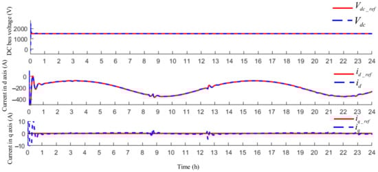 Active power in the grid-side converter is only related to the current component of the d-axis, while reactive power is only related to the current component of the q-axis. In this paper, the current reference value of the q-axis is set to zero to deliver the maximum active power into the grid. Additionally, in the d-axis, it is a double closed-loop structure of voltage and current. The DC bus voltage is stable by adjusting the grid-connected active power. The simulation result is shown in Figure 7.