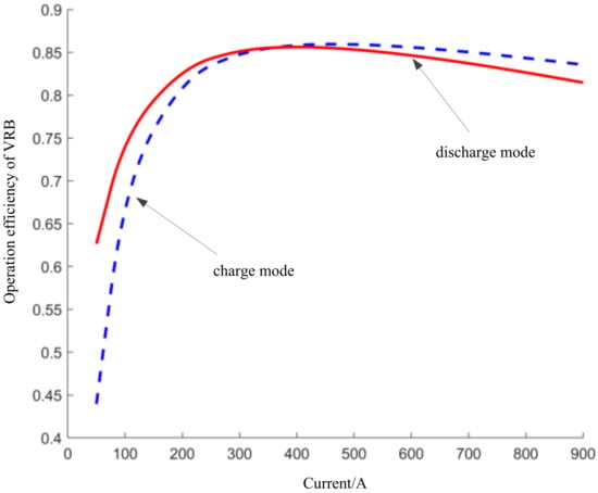 The charging efficiency and discharge efficiency of VRB both have maximum values according to Figure 9. However, the maximum values of charging efficiency and discharge efficiency are not at the same point. Under the charging mode, when the current reaches 470 A, the efficiency of VRB reaches the maximum value of 85.96%. Under the discharge state, when the discharge current reaches 388 A, the efficiency of VRB reaches the maximum value of 85.61%. Therefore, controlling the charge and discharge current value of VRB can improve the operational efficiency of VRB.