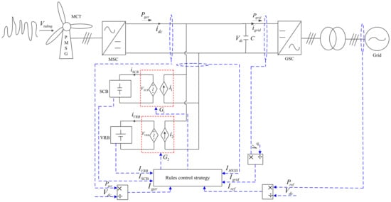 As shown in Figure 10, Pgrid represents the power injected into the grid, and ISCB and IVRB represent the current of the SCB and the VRB, respectively. The dynamic average model is applied to replace the detailed power devices in the bidirectional DC/DC converter [26] in this paper. It is defined that the current flowing into the SCB or VRB is positive, and the current flowing out from the SCB or VRB is negative. The internal control structure of the rule-based control strategy is shown in Figure 11.