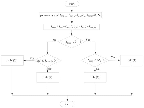 when “IHESS > 0”, it means that the output current Iger is greater than the grid reference value Iref. At this moment, the HESS should absorb the excess energy according to (11). Instead, if “IHESS < 0”, which means the HESS should release the required energy based on (11). If “IHESS = 0”, the HESS is in standby mode. According to the energy management strategy in Figure 11, “rule (1)” is applied if the charging current exceeds the threshold value under the charging state (“IHESS > ΔI1”), and “rule (2)” applies in the situation that the charging current does not reach the threshold value under the charging state(“0 < IHESS < ΔI1”). In addition, “rule (3)” is applied when the discharging current does not reach the threshold value under the discharging state(“ΔI2 < IHESS < 0”). If the discharge current has exceeded the discharge threshold (“IHESS < ΔI2”), then “rule (4)” is running. Through the above four rules, the operational efficiency of VRB is improved.