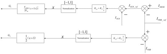 The control structure is shown in Figure 12. The current reference values of SCB and VRB are determined by control rules. Kp1 and Ki1 are parameters of PI controller in the SCB control loop, and their specific values can be found in Appendix A: Table A1. The output value of the PI controller is proportional to the charge or discharge power of SCB. The value of normalization is “0.2 (Vrated)2”. In the same way, Kp2 and Ki2 are parameters of PI controller in the VRB control loop, and their specific values can be found in Appendix A: Table A1. The value of normalization is “20 (Vrated)2”. Additionally, the control signal gain G1 and control signal gain G2 are output values.