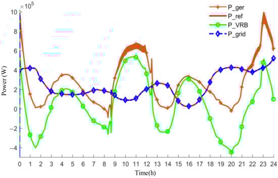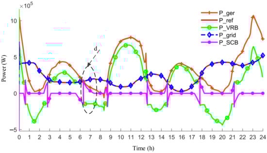 As shown in Figure 16, the mark “d” is used to determine the rated power and capacity of the SCB; P_ger is the marine current power captured by PMSG; P_ref is the grid-connected power command; P_grid represents the final real = 0 time grid-connected power; P_VRB is the real-time power of VRB. If P_VRB is positive, VRB is in charge mode; otherwise, it is in discharge mode. P_SCB is the real-time power of the SCB and its power is positive in the charging state and negative in discharging state. Under the energy management strategy based on a rule-based control strategy, the final actual grid-connected power (P_grid) can track the grid power command (P_ref) very well.