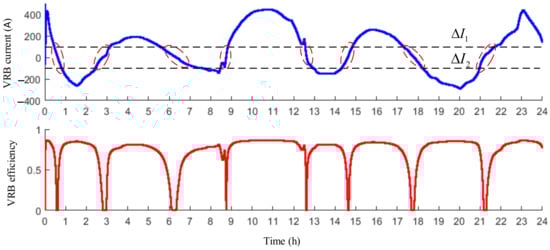 As shown in Figure 14, the operational efficiency of VRB is in a high-efficiency operation state for most of the time over 24 h. There is a transient low-efficiency state when the charge current value and discharge current value of VRB are lower than the current threshold (“ΔI1” and “ΔI2”). The average efficiency of VRB over 24 h is defined according to the Equation (17).
